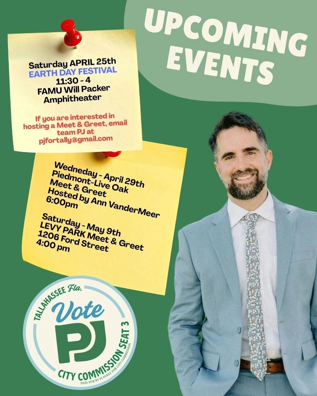 PJ Perez is traveling all over Tallahassee to ensure City Commission Seat 3 stays in the people’s hands. RSVP below to attend a campaign event!