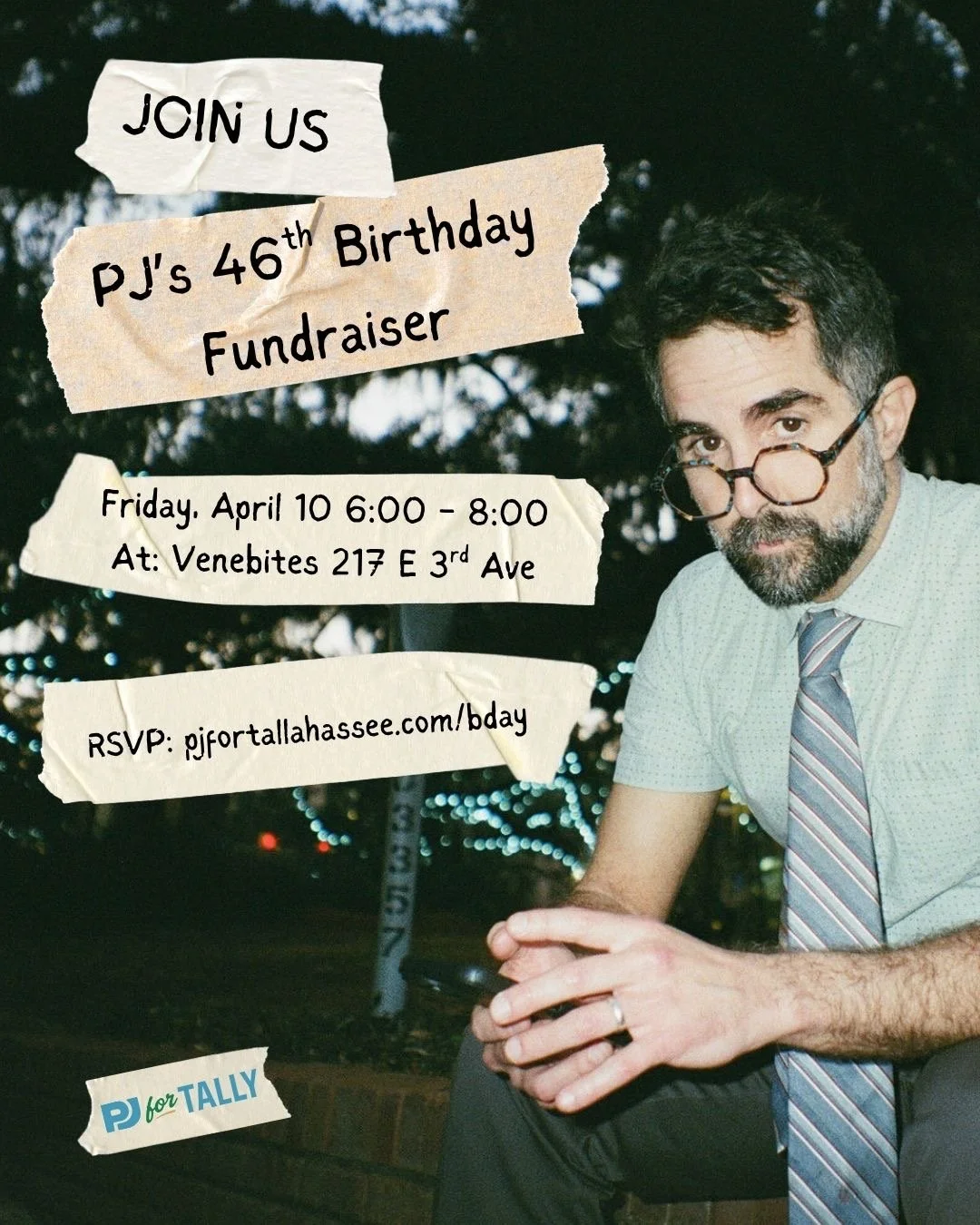 PJ For TALLAHASSEEBIRTHDAY PARTY PJ’s 46th birthday is just around the corner and you’re invited! RSVP via the form below and we’ll see you at Venebites on April 10 at 6pm!